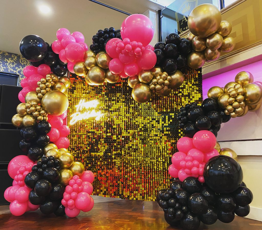 Organic Arch with 7ft * 7ft Shimmer Wall with LED Numbers. Price breakdown: Shimmer Wall £200.00 + Organic 20ft Balloon £400.00 + 2 Led Numbers £80.00 Total £680.00 Plus Delivery and Collection
